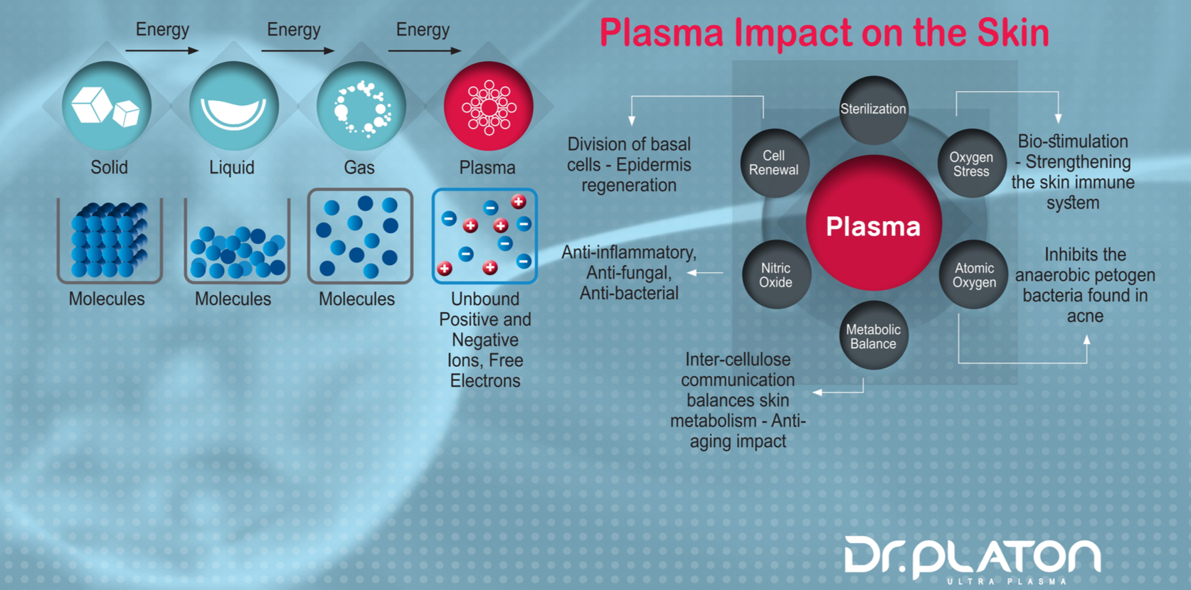 Plasma is one of the four fundamental states of matter (together with solid, liquid, and gas). It consists of a gas of irons – atoms which have some of their orbital electrons removed – and free electrons. Plasma can be artificially generated by heating a neutral gas, or by subjecting it to a strong electromagnetic field. Plasma of Oxygen and Nitrogen (the main gases in the air around us) has a major therapeutic impact on skin cells in the DNA level.