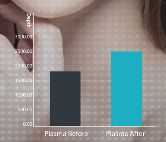 This graph compares the absorption of cosmetic substances by the human skin before and after plasma treatment.