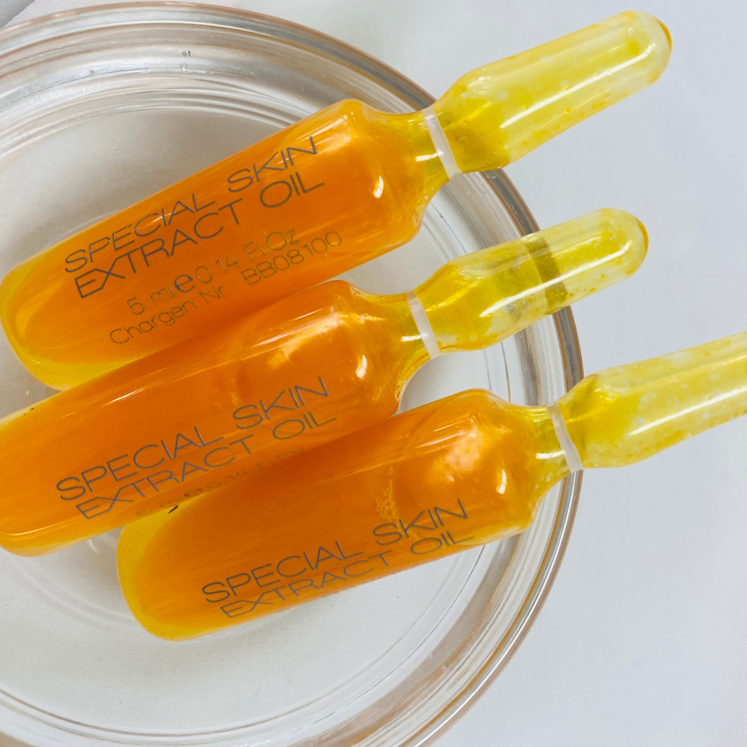 Key Ingredients of the Special Skin Oil Extract Ampoule are: Carrot Oil, Niacinamide, Tocopherol, and Retinyl Palmitate.